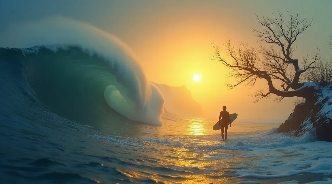 A solitary wooden bridge extending into misty morning fog over a calm lake, with the first rays of golden sunlight breaking through the clouds above. Delicate water lilies float near the bridge's base, while distant mountains emerge softly from the haze. Warm amber and soft blue color palette creating a sense of peaceful transition and gentle hope, professional photography, natural lighting, 8k, masterpiece, absolutely no text, no letters, no numbers, no writing, no watermark, no logo